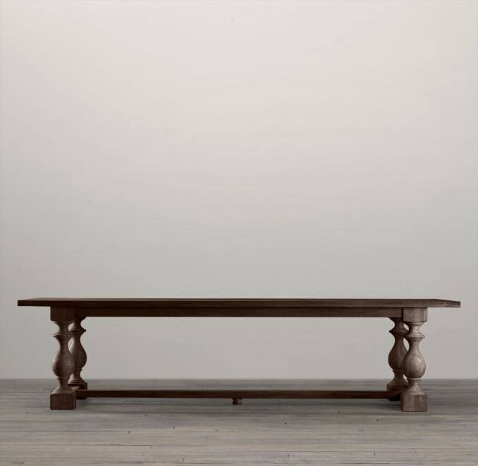 Restoration Hardware's 17th Century Monastery Rectangular Dining Table in Brown Acacia finish features balustrade and trestle design is priced at $1195.